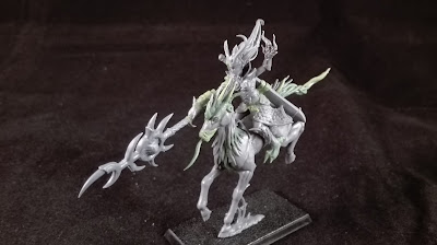 Sur la base d'un Elfe sylvain sur cerf. Le gros du travail se situait sur la monture, avec les cornes qui ont été retravaillées pour former un entrelacs autour d'un symbole de slaanesh, tandis qu'un caparaçon était resculpté sur le poitrail.